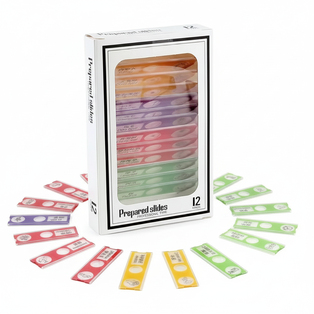 The Microscope slide set features a diverse 48 pcs collection of professional-grade samples, carefully divided into four categories of: insects, plants, flowers and animals.